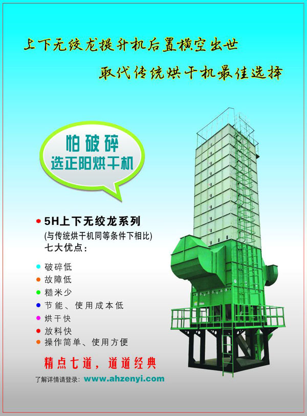 為了更好的滿足市場和客戶的需求,正陽科技推出一款“上下無絞龍系列”谷物烘干機。糧食破碎霉變猛于虎,正陽烘干機保護糧食安全保護人類健康。正陽烘干機上下無絞龍系列比傳統(tǒng)烘干機節(jié)能減耗,是中國糧食烘干機上下無絞龍?zhí)嵘龣C后置發(fā)明者與領(lǐng)航者。